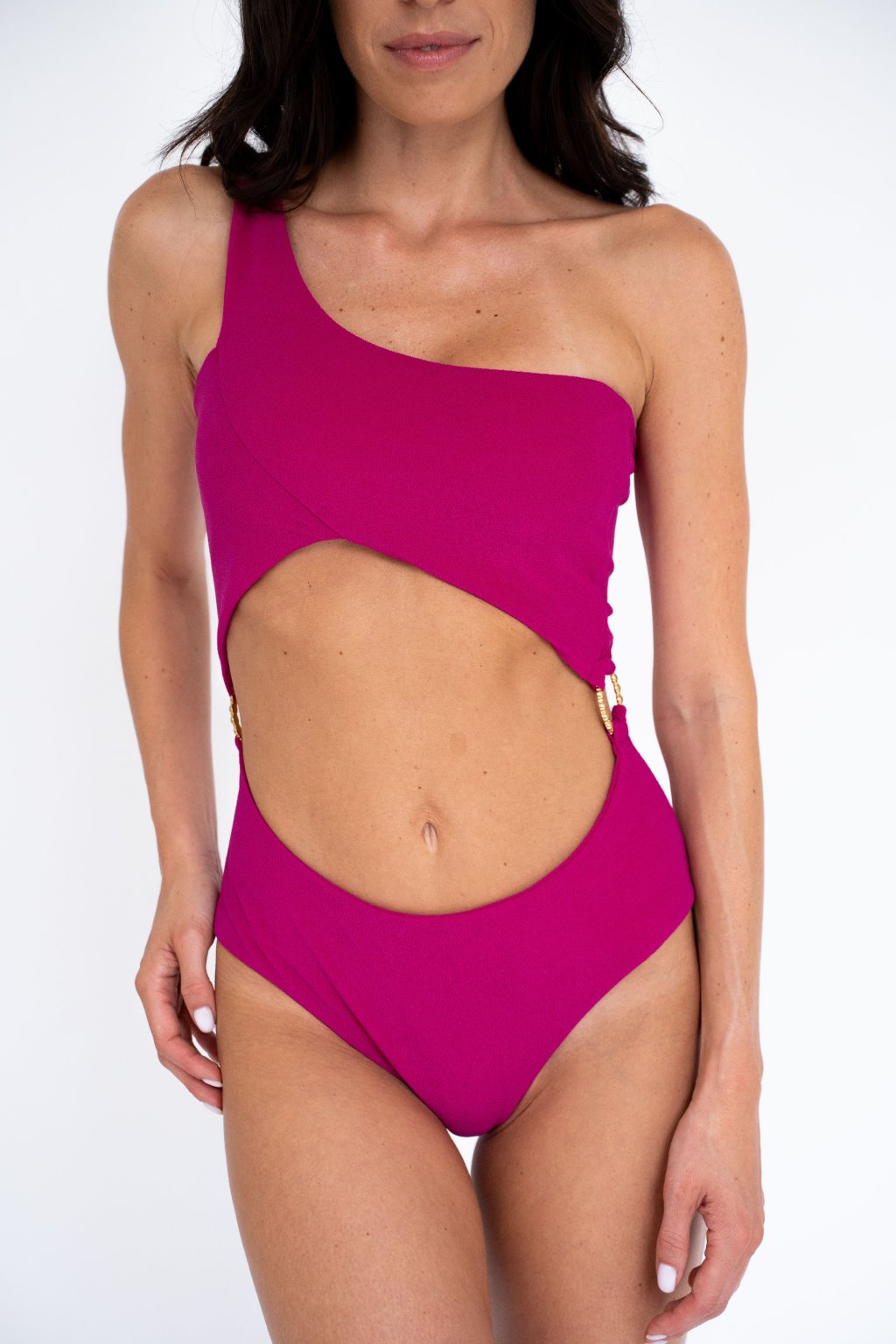 Tyto jednodílné plavky mají moderní a elegantní design s asymetrickým střihem na jedno rameno, který dodává stylový vzhled. Přední výřez zvýrazňuje pas a opticky tvaruje postavu, zatímco boční spojovací detaily přidávají jedinečný akcent. Vysoce vykrojený spodní díl prodlužuje nohy a zaručuje pohodlí i volnost pohybu. Tento model je ideální pro ženy, které chtějí být stylové a zároveň komfortní při každém pobytu u vody. Plavky mají užší střih doporučujeme zvolit velikost o číslo větší.